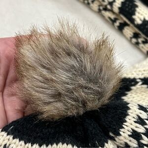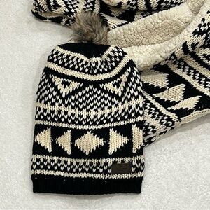 Beautiful black and cream knit with cream sherpa on the other side. Length lying flat: 34”, width: 9”