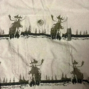 Size XL. Woolrich olive ombré moose stripe button up shirt. Front pocket that buttons. Missing two front buttons.