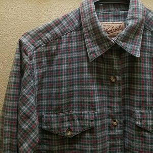 Green, red, and white plaid button down shirt from Woolrich. Womens fit accomodates hips but doesnt fit too feminine. Lightweight (for a plaid) so its great for layering!