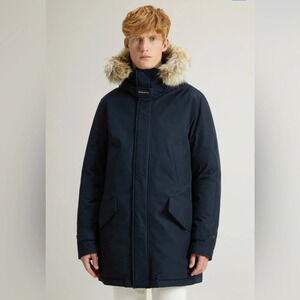 Woolrich Polar Parka in Ramar Cloth with High Collar and Fur Trim in Melton Blue