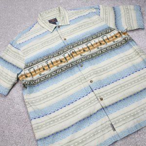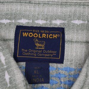 Woolrich Shirt Mens XL Blue/Green w/ Fishing Lure AOP Cotton S/S Button Up