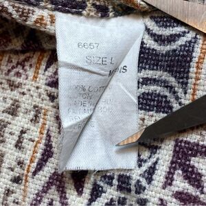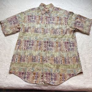 Woolrich Short Sleeve Button Down Shirt Size Large. Excellent used condition. 100% cotton. Brown, cream, green tone geo design. One front pocket. Measures chest 46”, length 32”, sleeve 10.5”.
