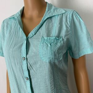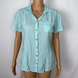 Nice light blue button down shirt with open collar and metal looking buttons. Extra button on inside/bottom. Short sleeves. In excellent condition.