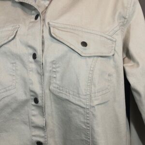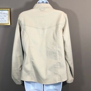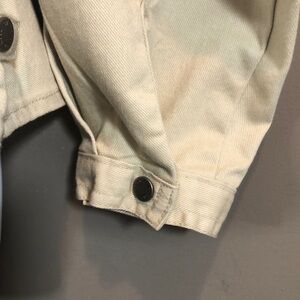 British tan, snap front, snaps on side to make more form fitting,snapped cuffs,could be worn as a light weight jacket,colors may vary due to lighting, EUC, Size: M