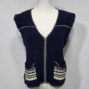 Woolrich Sweater Vest Womens Medium Navy Knit Open Front Pockets Fair Isle Trim
