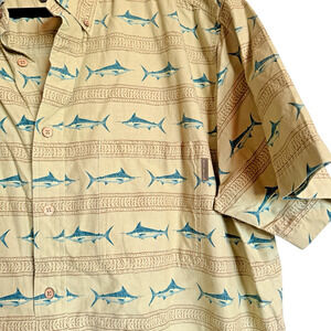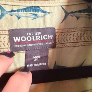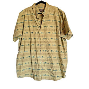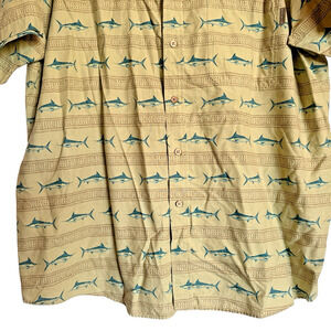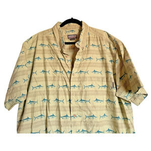 All over marlin print button down shirt - Sz 2XL - by Woolrich - great for the office, a cruise, or most any casual occasion. This shirt is in good preowned condition with no rips, holes or stains. Please see images for details and approximate measurments.