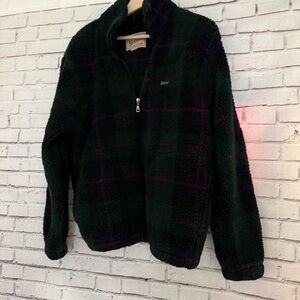 Warm fleece jacket with tartan pattern. Features a zip closure. Perfect for chilly days. Some signs of piling but in great preowned condition.
