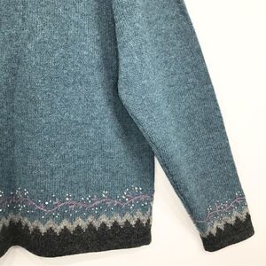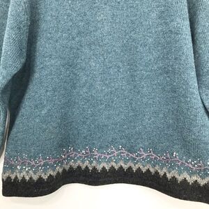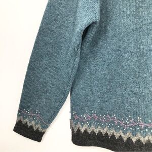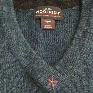Woolrich Teal Gray 100% Wool Embroidered V Neck Pullover Knit Sweater