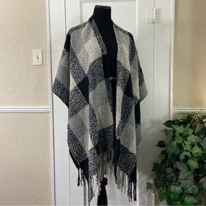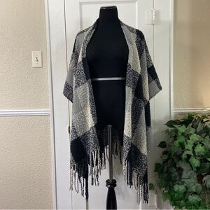 Black, grays and cream, longline, fringe hem, throw on and go. Very versatile! One size