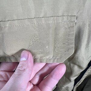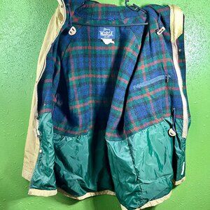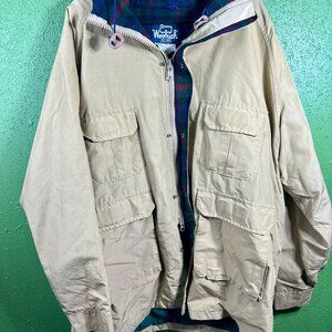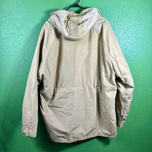 This is a vintage Woolrich parka. Size is XXL and color is khaki. Overall good used condition. There is writing on the tag and an iron on patch of a previous owners name. Small blemish on one of the pocket flaps (pictured).
