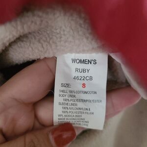 Great preowned condition beautiful ruby red color faux fur lined button front jacket shacket sz S