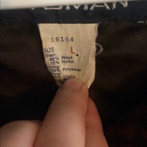 This Woolrich pea coat combines elegance and warmth with its notched lapel and textured wool blend fabric. The rich purple and black hues add a touch of sophistication, making it a perfect choice for cooler seasons. Its mid-length design ensures a flattering fit for any occasion. Both zips and buttons closed. Measures 25” across chest, 19” shoulders, 24” sleeves, and 35” shoulder to hem.