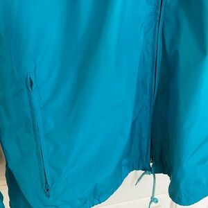 This Woolrich women's rain jacket is perfect for any outdoor activity. The jacket features a solid blue color, long sleeves, and a full zip closure with accent zipper pockets . It is made of lightweight nylon material and is hooded for added protection from the elements. Hood can be put away in zippered neck holder. Size large.