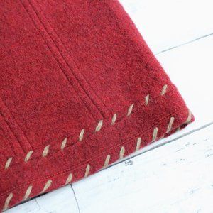 This wool vest is a deep blood red color with silver tone metal buttons. It has a collar, faux breast pockets and tan embroidered stitching near the hemline. It is vintage and is in excellent near to new condition.