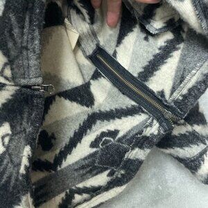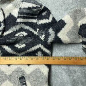 Soft wool blend hooded sweater with tribal patterns in black, white, and gray tones. Features front pockets, side zippers, and button neck closure. Size M.