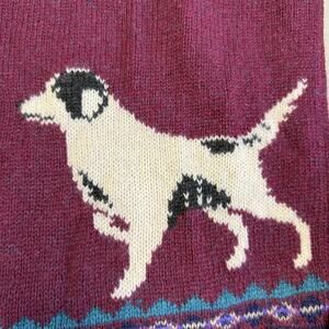 How adorable is this sweater? It does not have a size tag, but I have worn it and it’s a size medium. But I have a German shorthair pointer for a dog, and he got a little jealous that I was wearing a different dog on my sweater, and he made me sell it .
