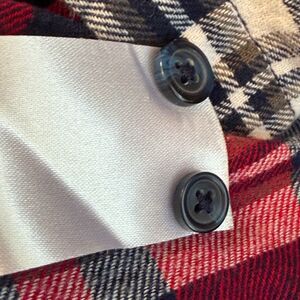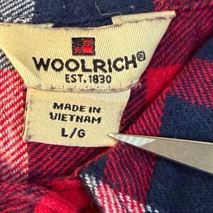 Classic Woolrich women’s flannel shirt featuring a red, navy blue, and white plaid pattern. Designed with a button-front closure, pointed collar, and a single chest pocket. Made from 100% cotton flannel with a soft, comfortable feel—great for casual wear, layering, or outdoor style. Labeled size Large (L/G). Please reference measurements for best fit.