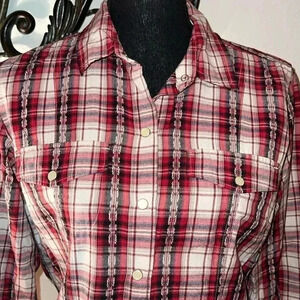 Woolrich Women’s 100% Cotton Western RED Plaid Fitted, Long Sleeve, PEARL Snap Buttons blouse top in EXCELLENT condition! No holes or stains. Size: Medium