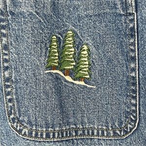 Great used condition, long sleeves, slightly oversized, collar, snow on evergreens embroidering on front pocket and back of top.