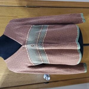 nice button up cardigan by Woolrich no issues excellent condition is missing fabric content tag green and rust colored size large