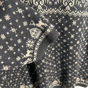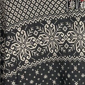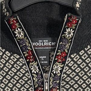 Beautiful Woolrich sweater in size XL. Gray winter themed pattern with snowflakes, deer, houses in the snow. Contrasting grosgrain floral trim on the zip-up V-neck.