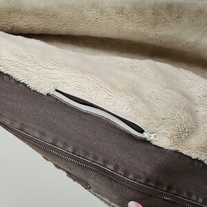 Woolrich anorak utility sherpa lined hooded jacket olive green thrashed distressed small, velcro and zipper closure, toggles at hem inside for cinching fit.