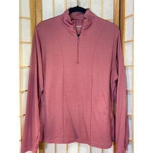 Red and white checked quarter zip from Woolrich. Size large. Zippered pockets with mesh lining. 85% cotton, 15% polyester. Machine washable. Made in China. Excellent condition. Nonsmoking home.