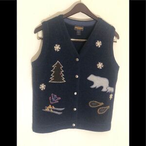 Woolrich Womens Wool Vest Skis Bear Winter Scene Tree Blue 100% Wool Size M