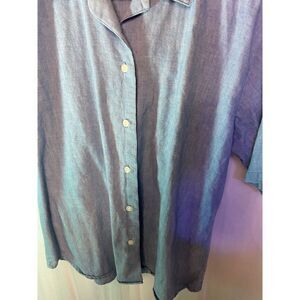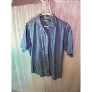 Blue denim chambray button-down blouse.