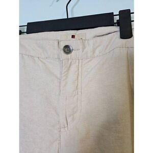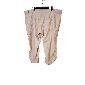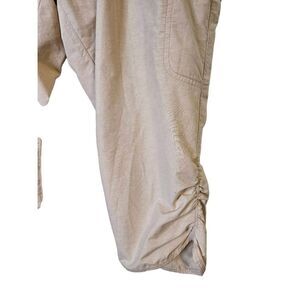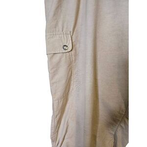Waist is 42/43 inches, rise is 10.5 inches and the inseam is 21 inches. 2 back pockets, 2 front pockets, 2 leg pockets, zipper/button closure, cinched at the bottom of leg. Cotton/nylon blend. Tag says 14, but I sized on the waist measurement. Machine washable. Very good condition, no flaws.