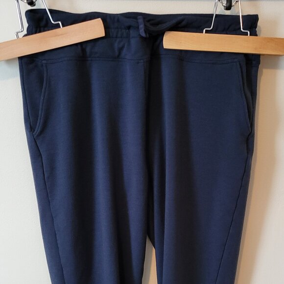 Woolx Willa joggers in navy blue. Size XL. Soft material made of 85% merino wool, 12% nylon, 3% spandex. Sits at waist. Measures: waist 17", hips 22", inseam 28".