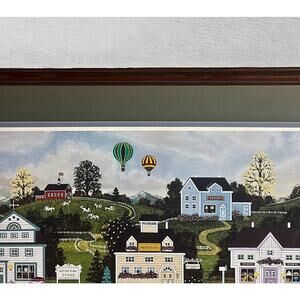 This piece features Scott’s classic Americana folk landscape: horse-drawn carriages, cottages, shops, a covered bridge, swans on the water, and hot-air balloons drifting above rolling hills. The colors are vibrant, detailed, and instantly recognizable to Wooster Scott collectors.