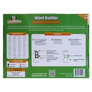 WHAT'S INCLUDED: The Word Builder Puzzle has 104 color-coded, double-sided, dry-erase pieces with a letter printed on one side, and the tracing of that letter on the other. Each piece is color coded with a consonant/vowel designator and an uppercase/lowercase designator. Also comes with a dry-erase marker and eraser and a resource sheet with instructions, helpful hints, and fun games ideas!