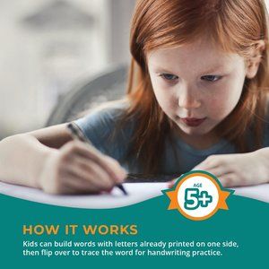 HOW IT WORKS: Kids can build words with letters already printed on one side, then flip over to trace the word for handwriting practice. Game ideas are also included.