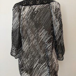 This is a great top from Avenue. Made of a lightweight and semi sheer chiffon. It looks great tucked in to a black skirt or dress pants for work or worn loose over jeans on the weekend. It has an unusual abstract print in black and light grey. There are functional brass buttons on the partial placket.. Inset lace in the collar area Almost tunic length, depending on your height. In excellent used condition.