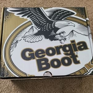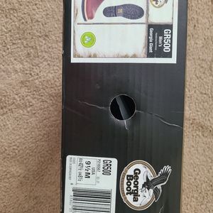 Mens-Genuine leather work boots by Georgia Boot. Size 9.5M Water resistant, (Non Steel Toe) has a small nic on the right front shoe, Received this way online from original retailer.