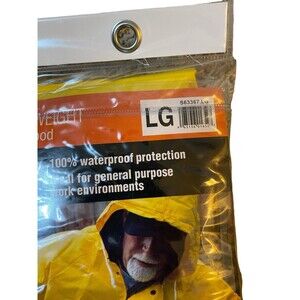 Work N Sport Heavyweight 3 Piece Rainsuit Size Large New. Yellow. Contains jacket, bib overalls, and hood. PVC on polyester, .35mm and 14 mil thick. New in package, never opened. Please see sizing chart in photos.