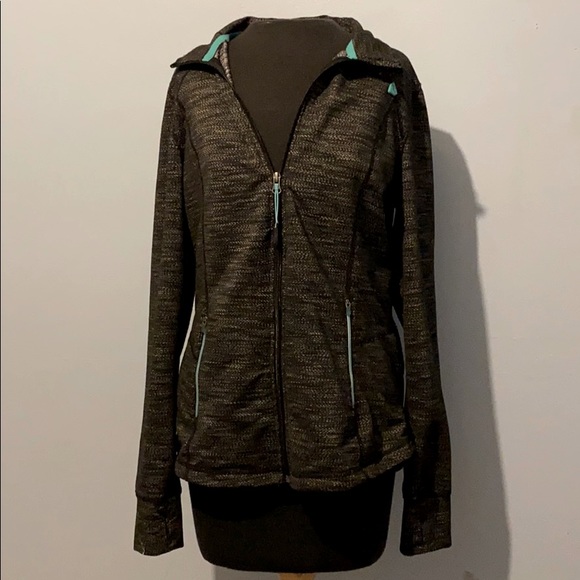 Black jacket made for working out, super stretchy. Has pockets. Teal/blue details. From the brand Tangerine size L.