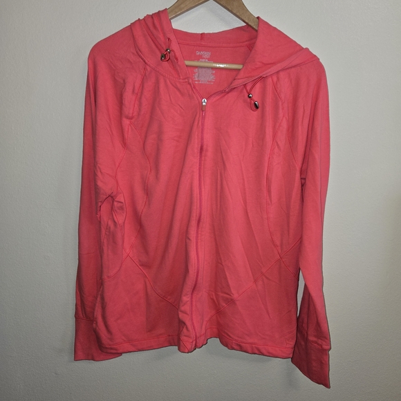 Vibrant coral jacket with zip closure. Ideal for everyday comfort. This runs small!