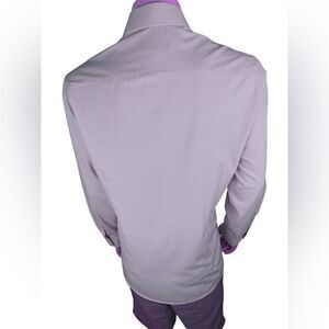 Awesome wrinkle-resistant long sleeved casual dress shirt with 4-way stretch by Work Rest Karma Clothing. It’s white with tiny lavender circles, 86% polyester and 14% spandex, and is in excellent, like new condition. The size 17.5 measures as follows: