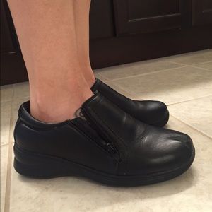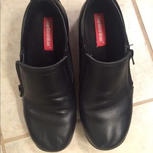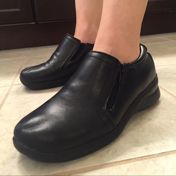 A good work shoe needs to be comfortable, durable and safe and thats exactly what these are at a fraction of the price! I purchased these from Boot World these shoes are roomy, comfortable, and slip resistant. They have a side zip on each shoe for easy on/off. There is minor scuffing on the toes, but they are practically brand new and will last you years. They still have that fresh out the box shine to them :)