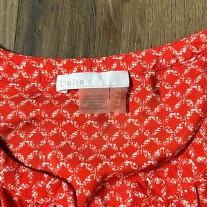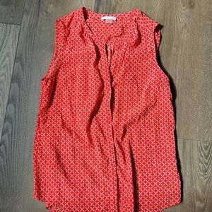 Red/orange patterned- hidden button front with notch neck.