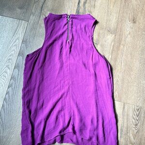 Purple high-neck- zip detail at back- asymmetrical hemline- flowy, lined.