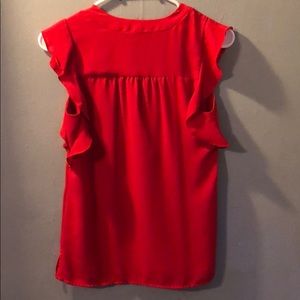 Flutter sleeves, pleating at shoulders, and three button closure at front. Very cute paired with black pants or a pencil skirt for work!