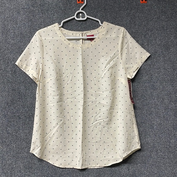 Merona, size M, NWT, work blouse. Cream colored with navy colored polka dots.