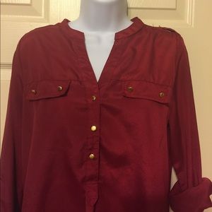 Red silk work blouse. Gold button detailing and buttons on shoulders. Can wear sleeves rolled and buttoned up or down and buttoned. Machine wash cold, tumble dry low