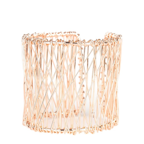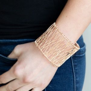 Wire after wire crisscrosses across the wrist, coalescing into an edgy cuff