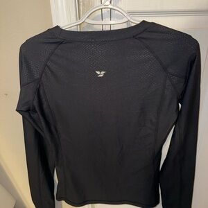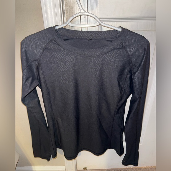 Black women's long sleeve performance top with a subtle textured pattern. Lightweight, breathable fabric for all-day comfort. Slim, flattering fit ideal for workouts or casual wear. Easy to care for and versatile for layering.