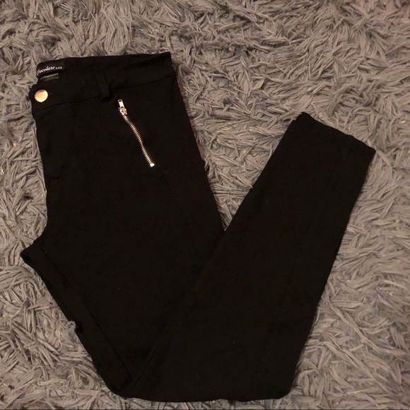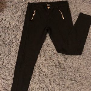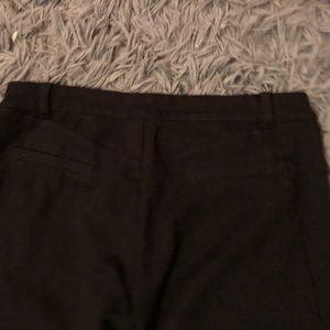 Black legging work pants. Comfortable fitting leggings suitable for work. Fake front pockets.
