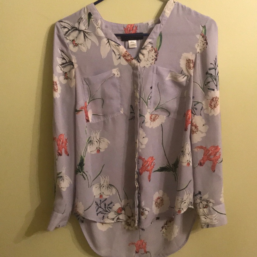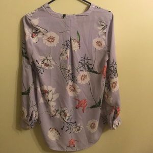 Chiffon floral long sleeve gray for work in the summer. Lower in the back so you can wear with leggings. Can roll up sleeves or leave down. Fabric resists wrinkles better than most. Flap to cover buttons in front.